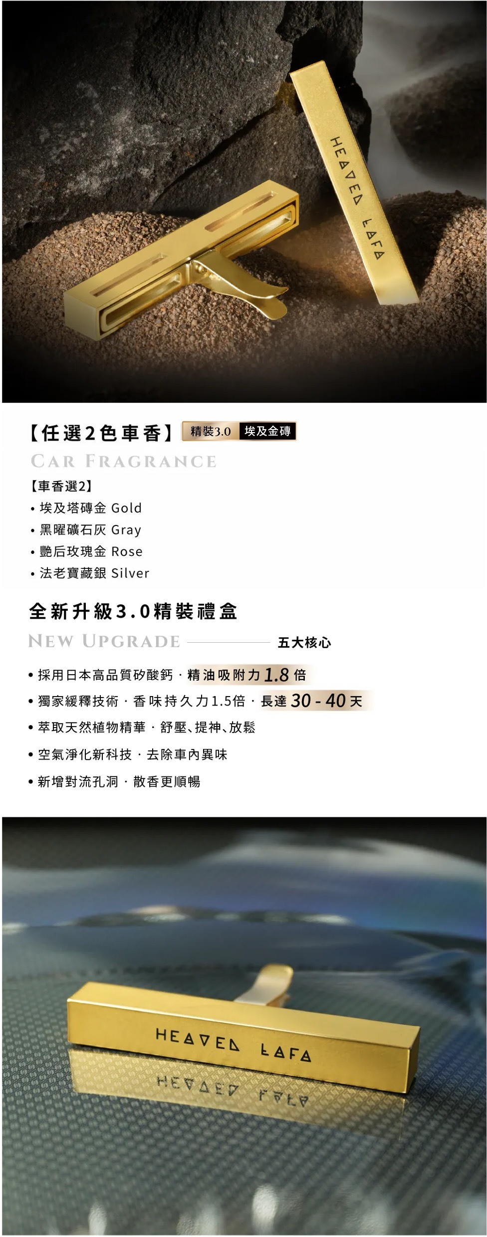 包裝內含物:金磚夾x1、燙金說明書x1、香薰片補充包x4款(共2組)